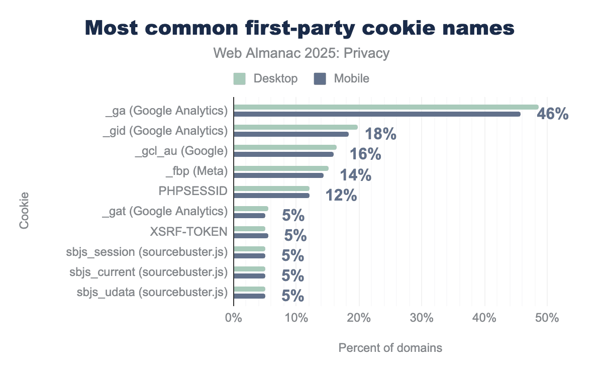 The usage of cookies on the web remains largely for tracking purposes. Among the functional exceptions, PHPSESSID stores a unique session ID for PHP applications on 12% of pages, while XSRF-TOKEN handles security against cross-site request forgery and is found on 6% of webpages.