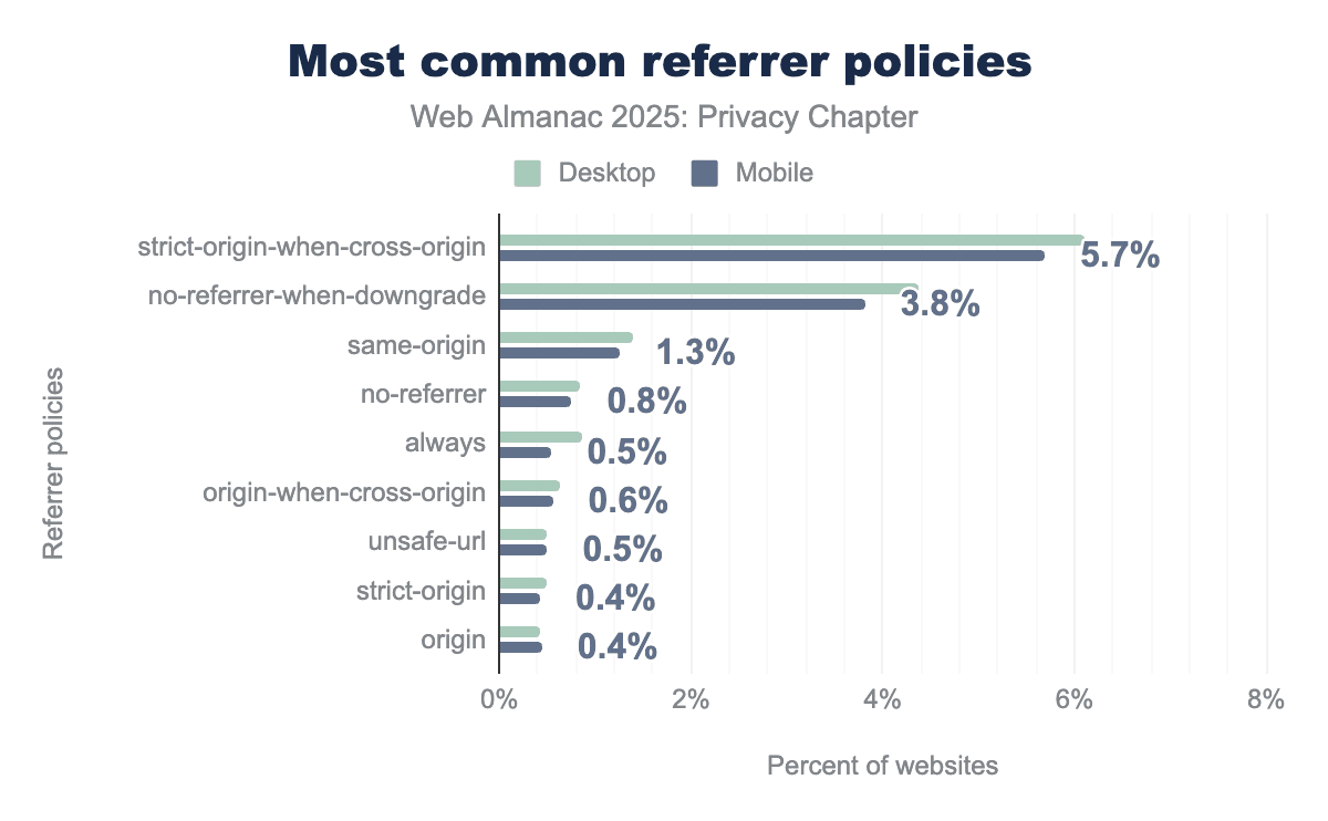 On the positive side, truly restrictive options like same-origin (1.26%) and no-referrer (0.75%) remain in use, though adoption is low. These policies share nothing with third-party sites, ideal for privacy, but sometimes limiting for analytics and affiliate tracking that sites rely on.