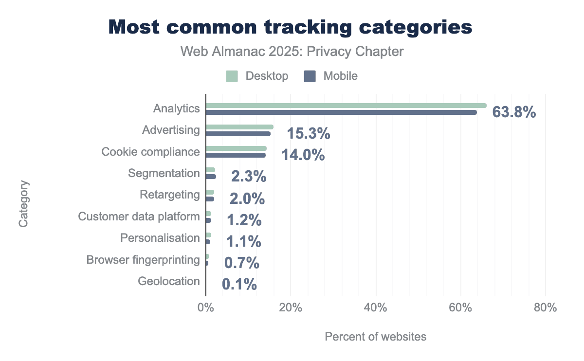 Furthermore, when categorizing these services by function, Analytics dominates the landscape, appearing on 64% of desktop webpages. Advertising and Cookie compliance tools follow at 15% and 14% respectively, illustrating that performance monitoring remains the primary driver of data collection. More specialized tracking methods, such as Segmentation and Retargeting, are significantly less common, each found on fewer than 3% of sites.