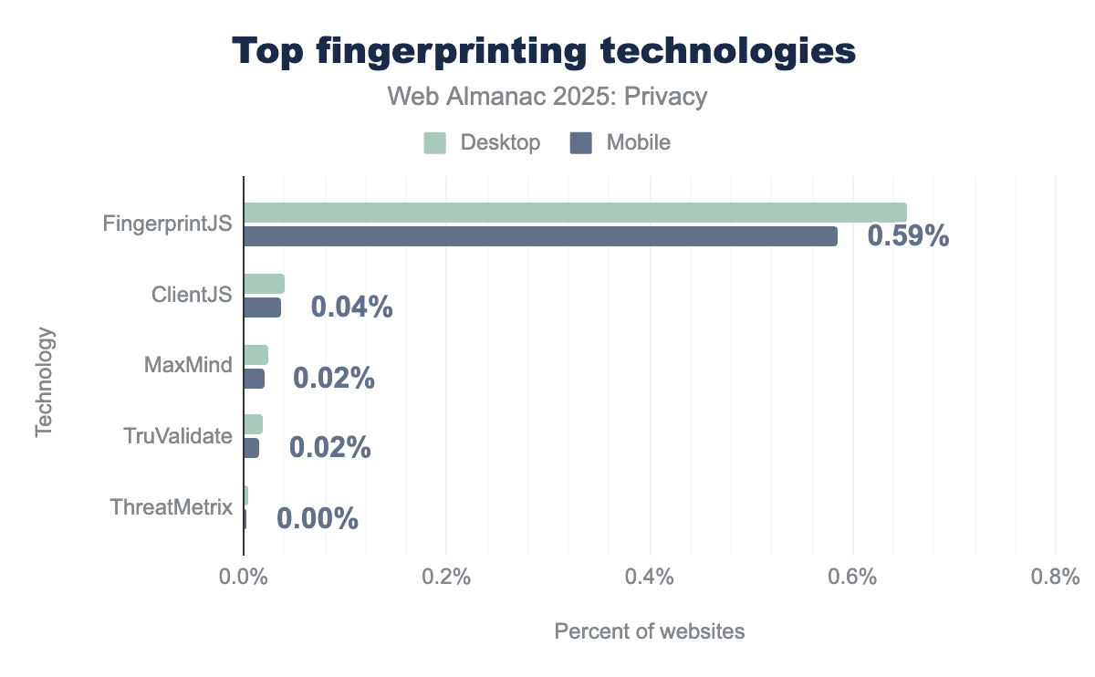 Of note, the library FingerprintJS has remained the most popular tool to conduct browser fingerprinting, far surpassing the others. FingerprintJS is used on 0.59% of mobile accessed websites, compared to ClientJS (the next most popular technology) which is present on 0.04%.