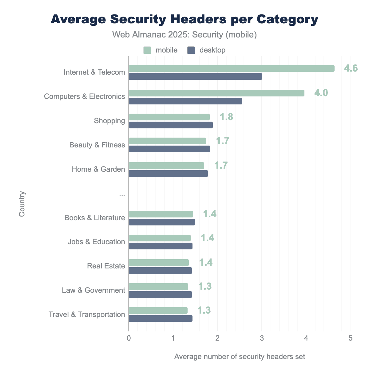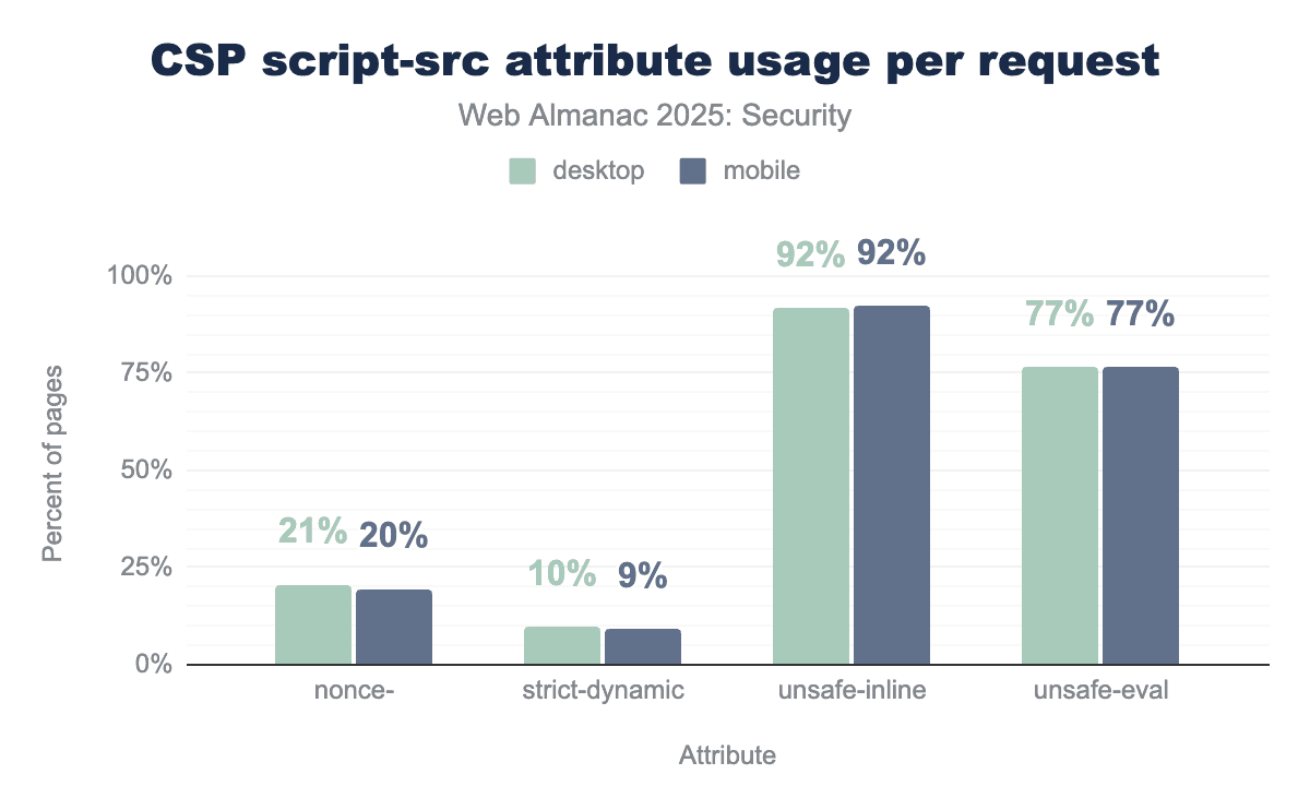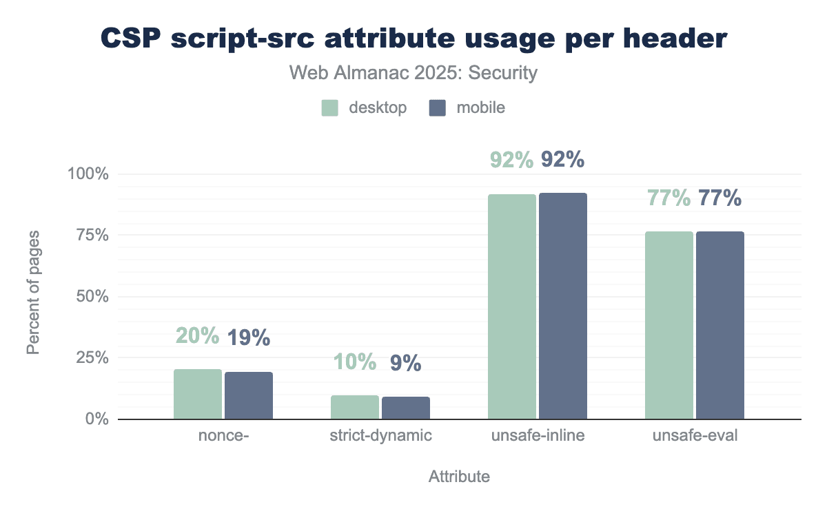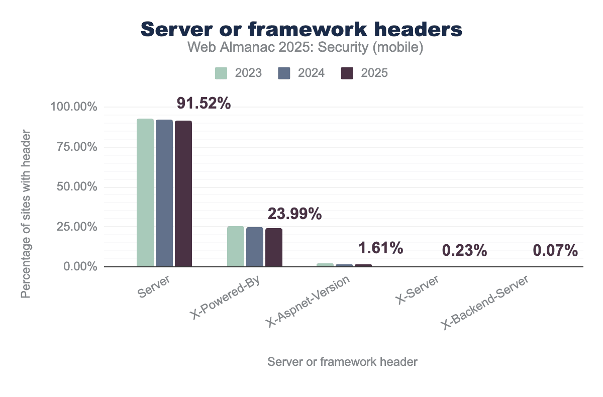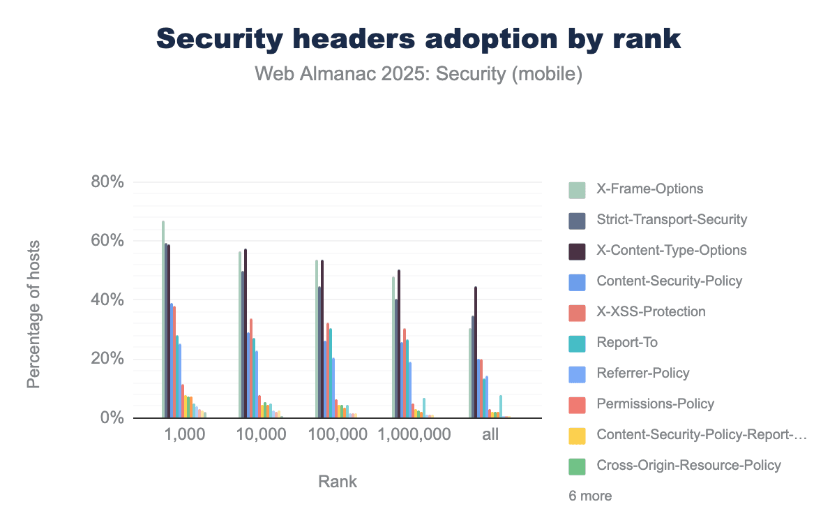 We find that around 0.11% of mobile sites attempt to set security headers that browsers explicitly do not support via <meta> tags. The most frequently attempted policies are X-Frame-Options, X-Content-Type-Options and Permissions-Policy. Compared to 2024, we see that the number of mobile sites setting these policies in <meta> rose in absolute numbers by more than 5,000 pages, showing that these misconfigurations are still actively being set by developers.