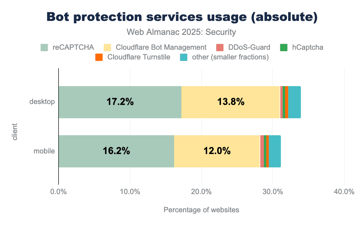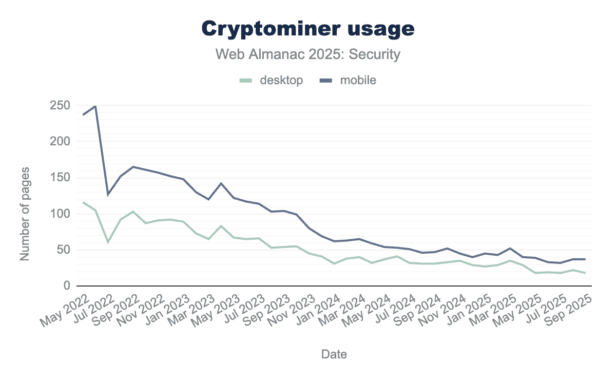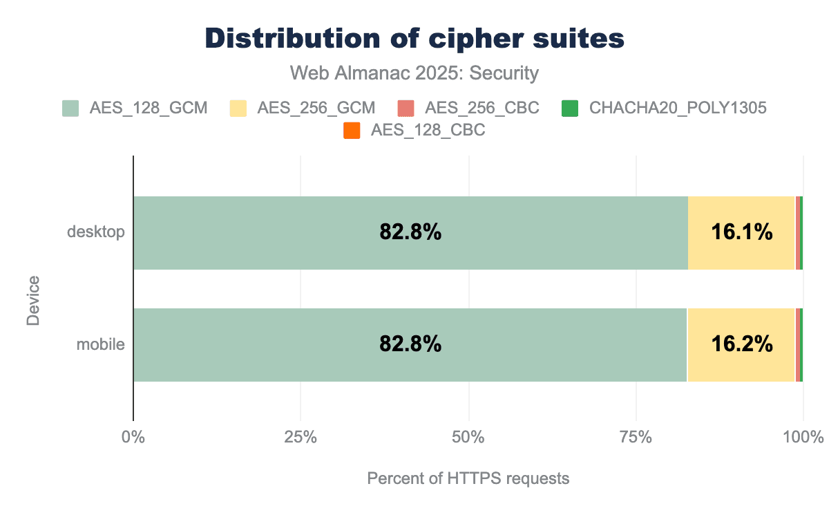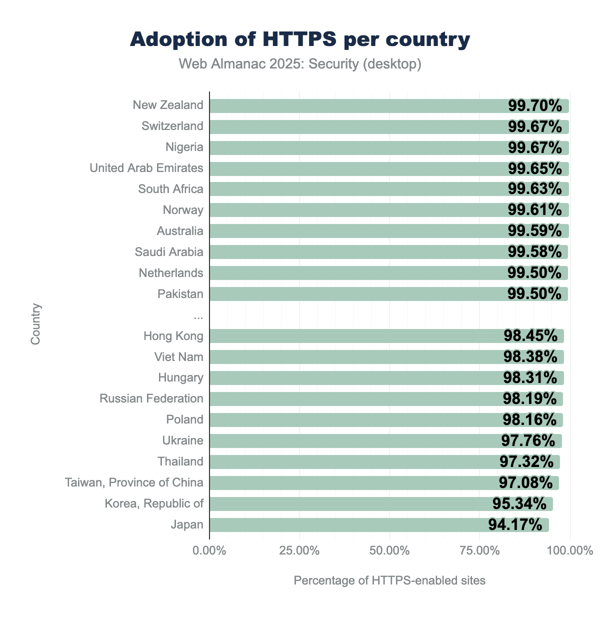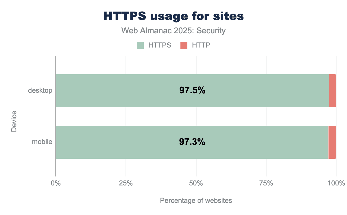 The share of requests that are being sent using HTTPS rather than using plain HTTP creeps ever closer to 100%, rising by another 0.74% on mobile compared to the 2024 edition of Web Almanac.