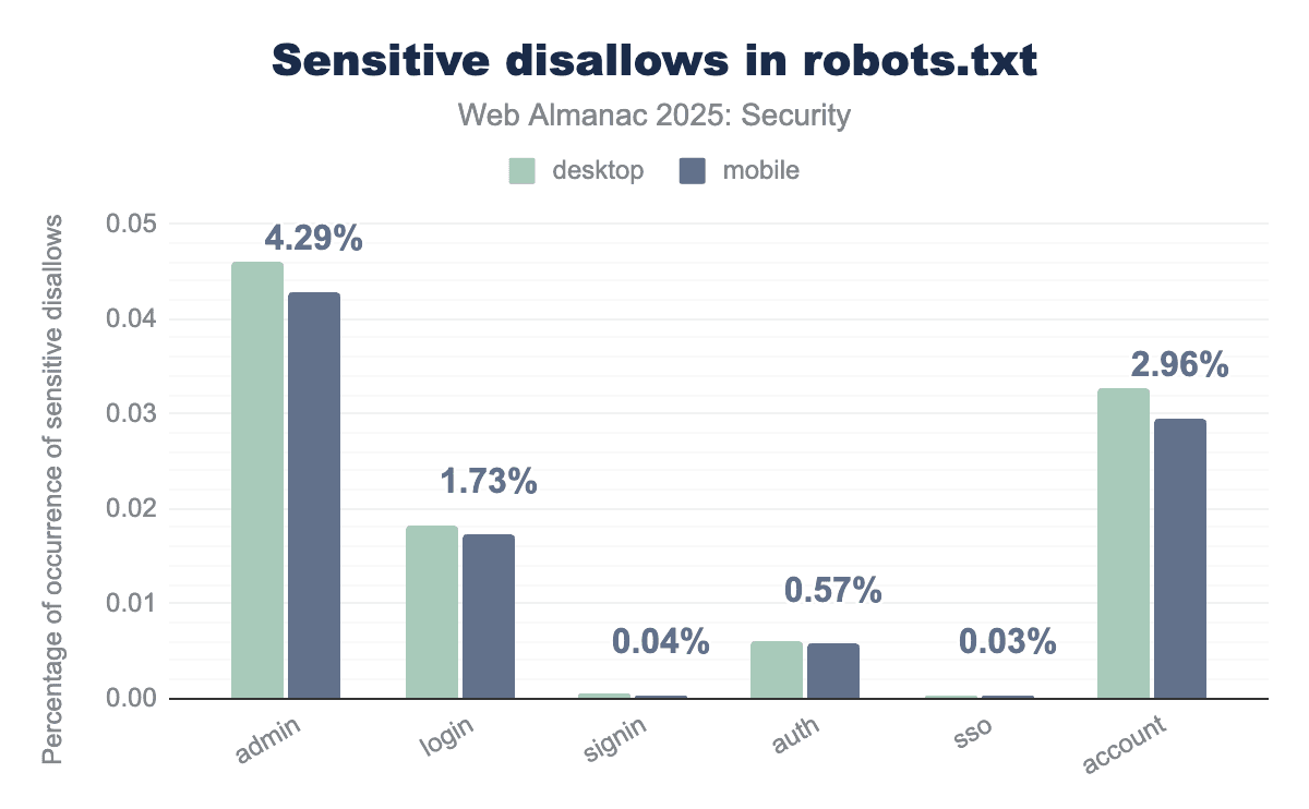 Finally, we check whether sensitive endpoints are disallowed to be visited by crawlers in the well-known robots.txt file. By checking the disallowed endpoints in this file, attackers may find pages to target. This year, 81% of desktop sites and 80% of mobiles sites hosted a robots.txt file, which is very similar to last year’s edition of the Web Almanac.