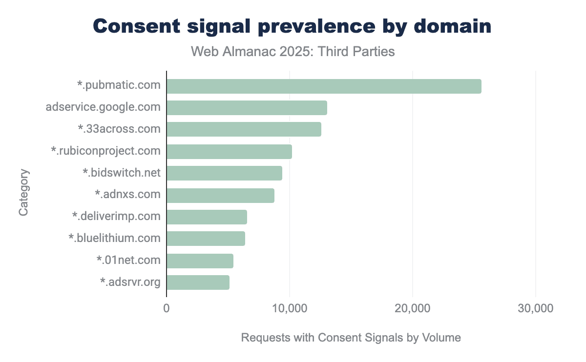 Among top-ranked websites, pubmatic.com receives the highest volume of consent signals, with adservice.google.com in second place. The majority of domains receiving the most consent signals are advertising and ad tech vendors—ad exchanges, DSPs, and ad servers. This makes intuitive sense, as in many jurisdictions third party advertising and analytics providers must obtain user consent before using user data for ads and other purposes.
