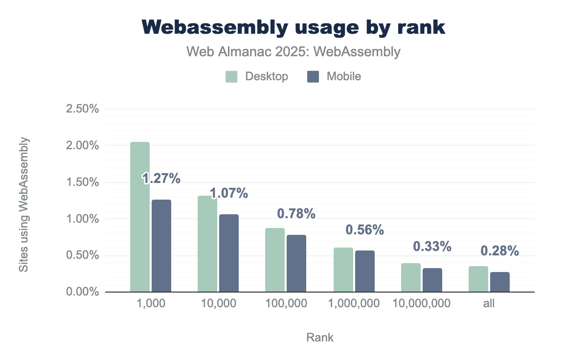 • Platform Parity: There is a very close correlation between desktop and mobile usage across all ranking groups. This confirms that Wasm is being used as a cross-platform solution rather than being restricted to desktop-only environments.